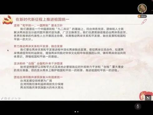 2004本科生党支部的万莉同志按照《台湾问题与新时代中国统一事业》白皮书的顺序,首先回顾历史,说明台湾是中国的一部分不容置疑也不容改变,而后阐释了中国共产党对于台湾问题的态度:中国共产党坚定不移推进祖国完全统一。万莉同志坚信:“祖国完全统一进程是不可阻挡的,在国家的发展进步下,‘台独’分裂势力是走不通的绝路,外部势力阻碍中国完全统一必定会失败。”