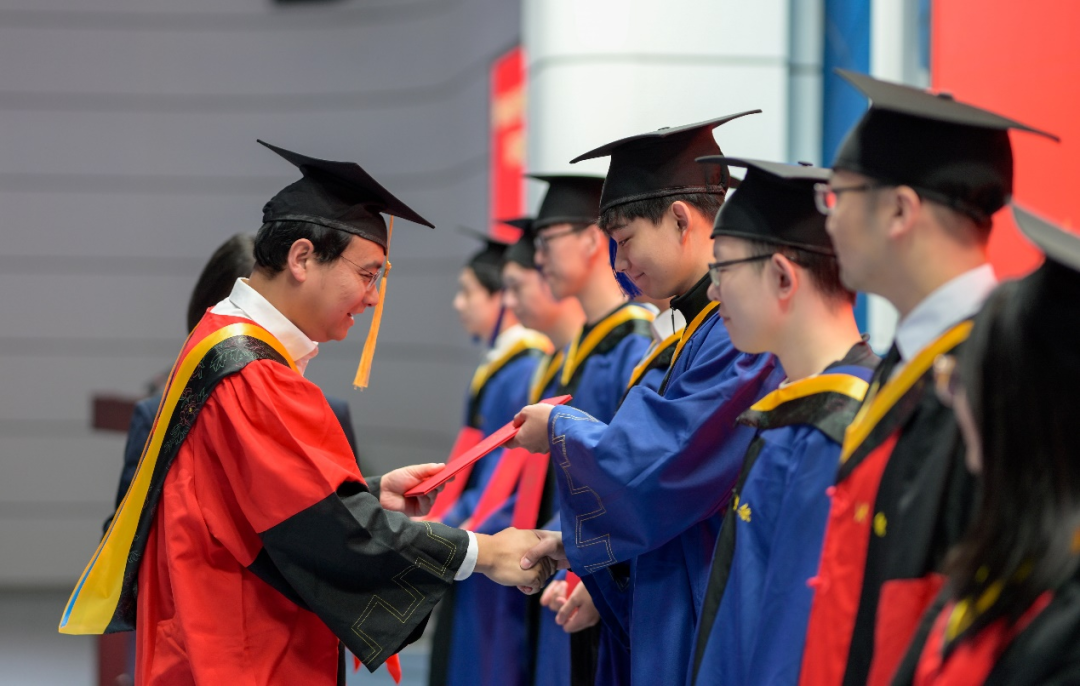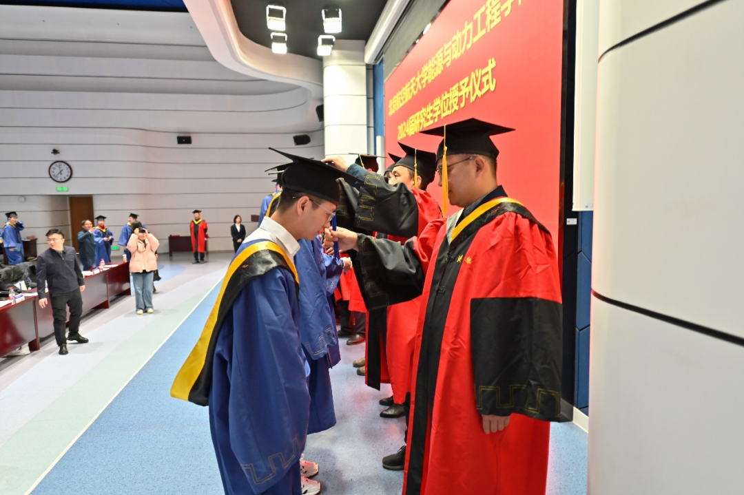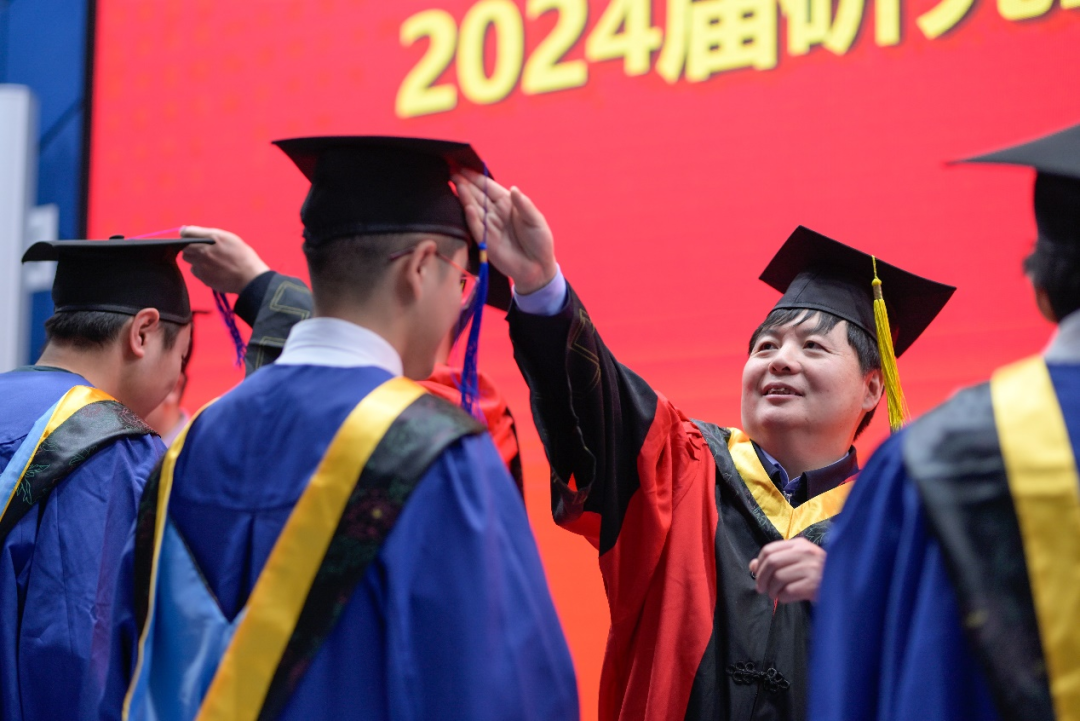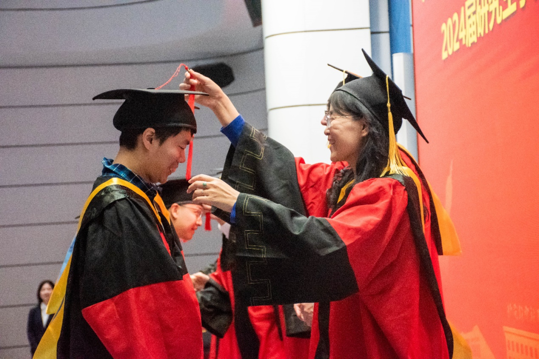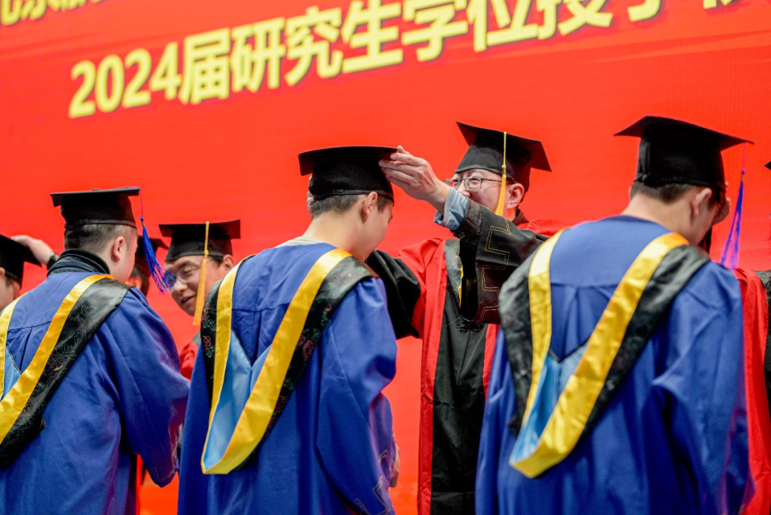 典礼最后,举行了2024届研究生毕业生学位授予仪式,院领导及导师代表为在场的毕业生——拨苏正冠,送上美好祝愿。