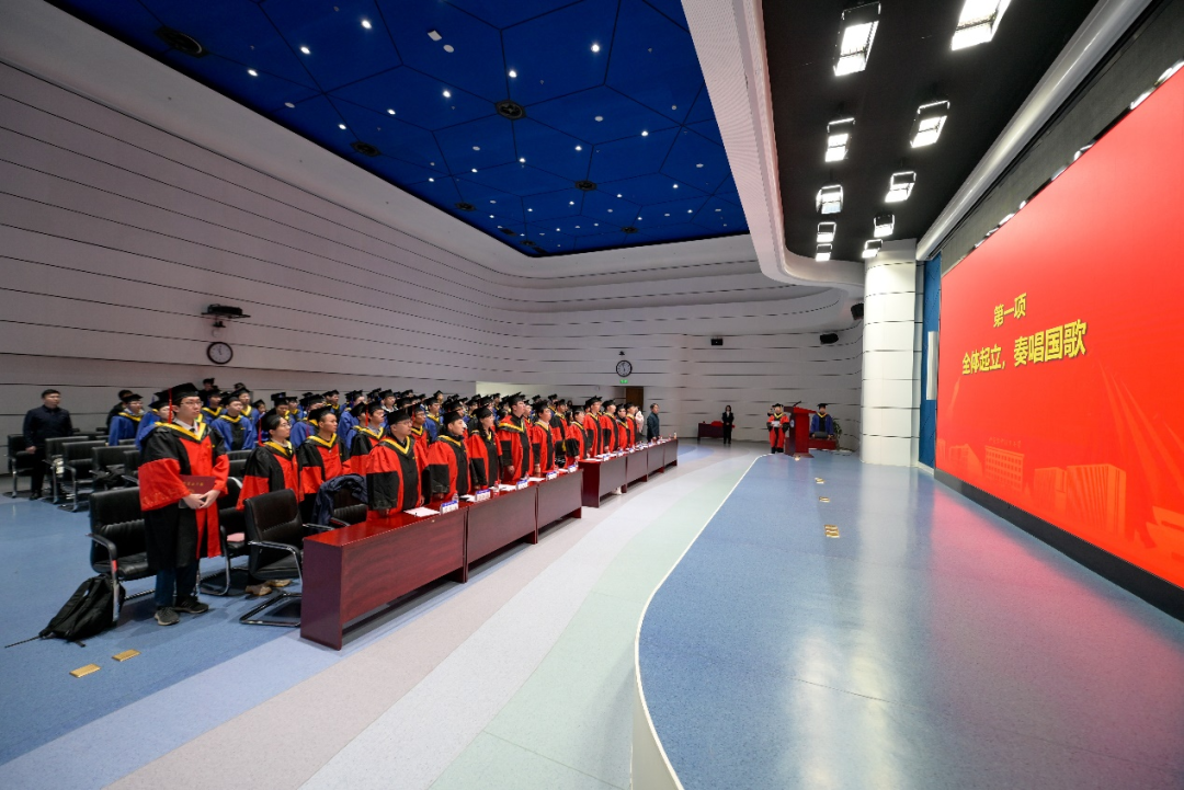 随着庄严的国歌响起,全体师生起立合唱,毕业典礼正式拉开帷幕。
