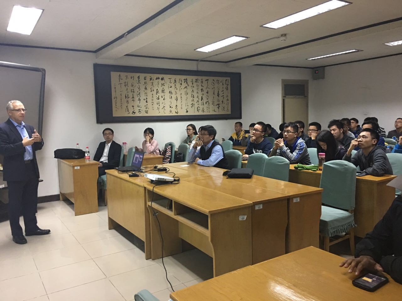 Tony Roskilly教授讲解思路清晰、内容新颖,平时略显枯燥的知识在这场交流会中显得鲜活生动、趣味横生。同学们被他的论述不断带入的同时,引发了对航空替代燃料、新能源开发前景等问题的思考,大家积极现场提出疑问。对于疑问,Tony Roskilly教授都一一耐心解答,并鼓励同学们深入地讨论,激发同学们的创新思维,现场气氛十分活跃。整场报告历时一个半小时。在拓展专业知识的同时,更重要的是激发了同学们思考和质疑的热情,很好地诠释了‘学·问’的魅力。